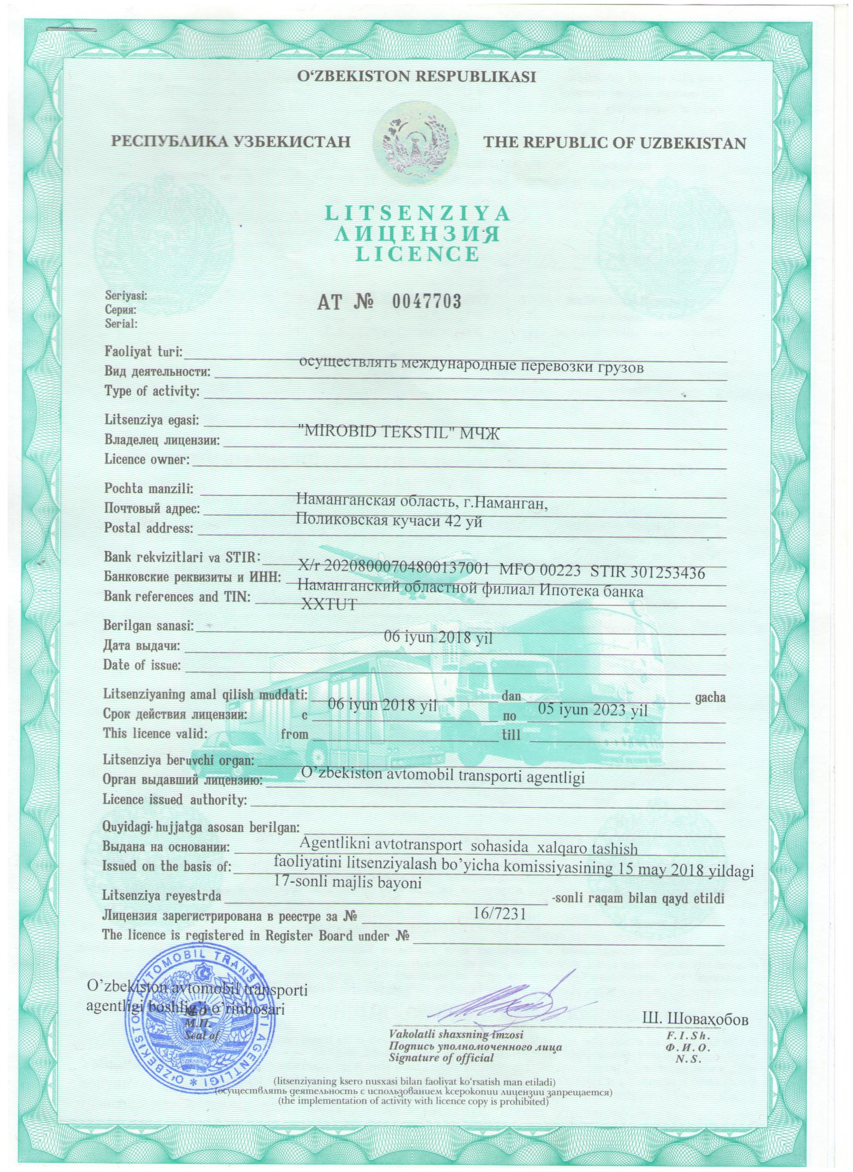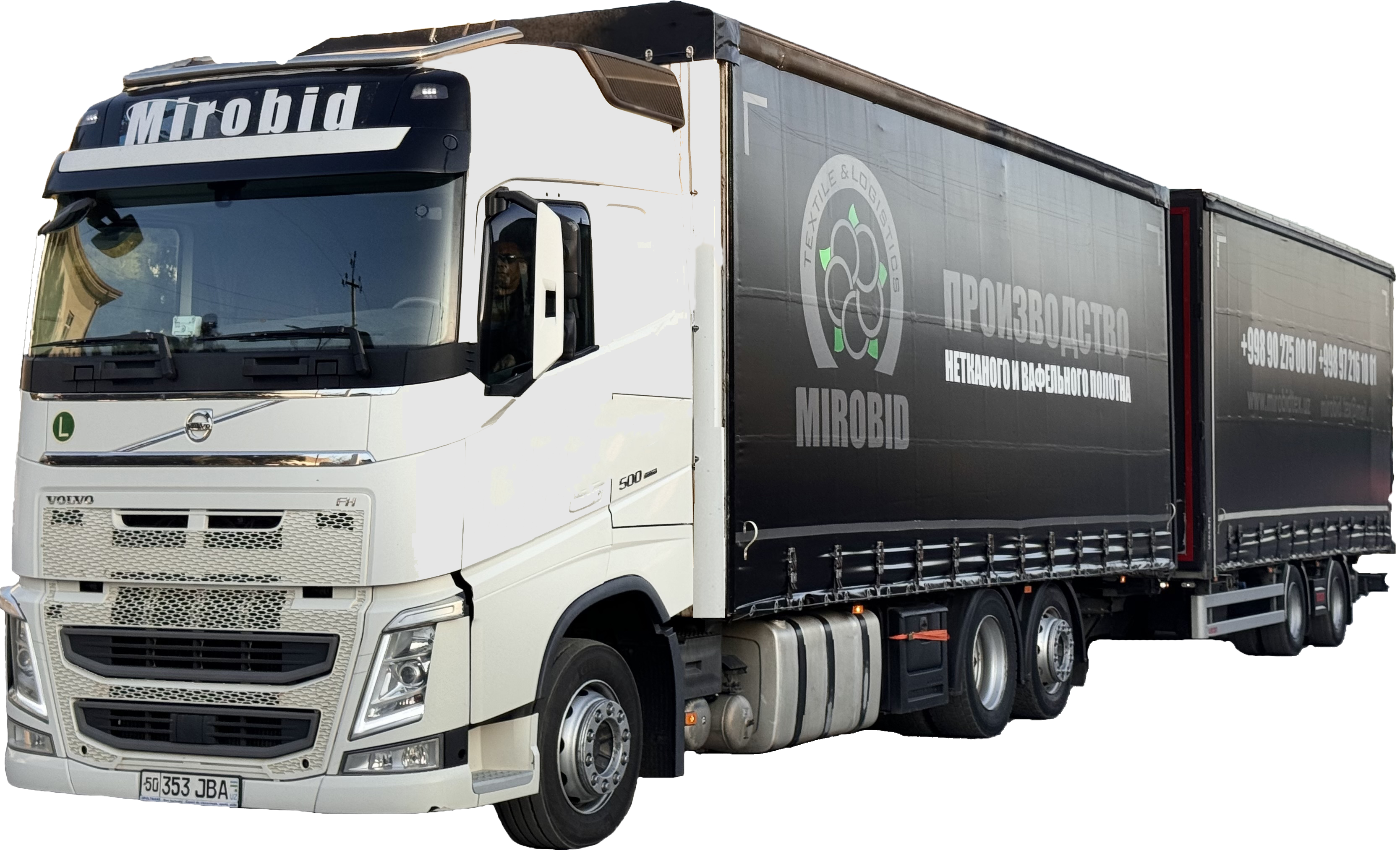 ООО «МИРОБИДТЕКСТИЛ» начало свою деятельность в 2009 году с перевозок собственных грузов. С расширением количество собственного автопарка с 2018 года начало оказывать услуги по международной перевозке грузов. На сегодняшний день наш автопарк насчитывает 50 шт собственных автопоездов. Из них 43 шт Прицепной автопоезд ( Паравоз 120м3, сцепка) и 7 шт Седельный полуприцеп ( Мега фуры 105м3). Автопарк постоянно обновляется и перед каждой поездкой проходит тщательной осмотр и техосмотр для целостной доставки грузов..