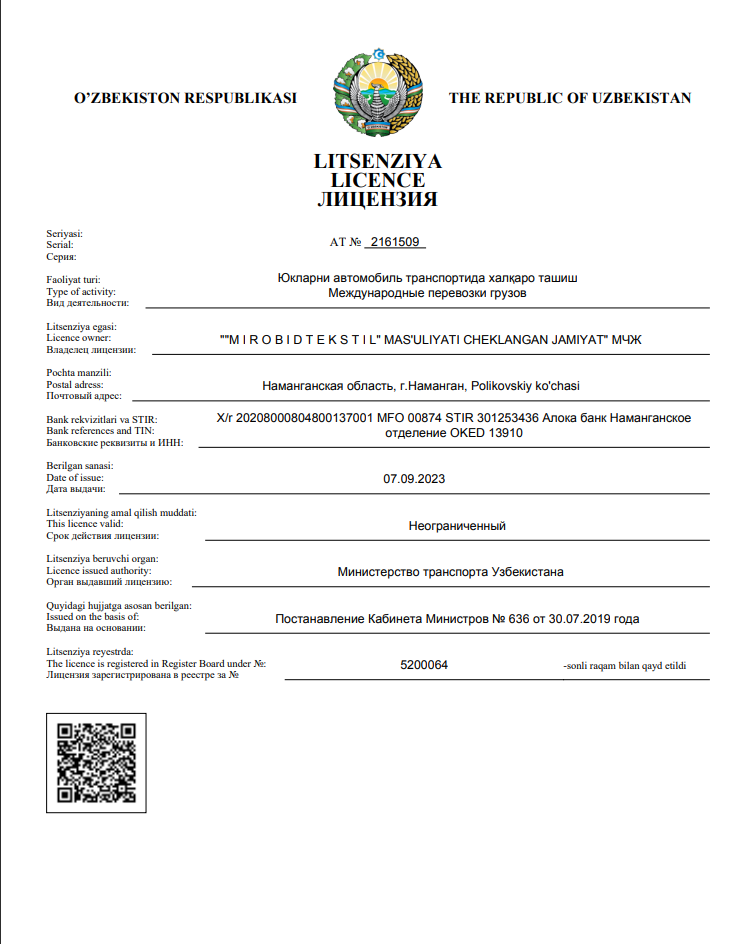 ООО «МИРОБИДТЕКСТИЛ» начало свою деятельность в 2009 году с перевозок собственных грузов. С расширением количество собственного автопарка с 2018 года начало оказывать услуги по международной перевозке грузов. На сегодняшний день наш автопарк насчитывает 50 шт собственных автопоездов. Из них 43 шт Прицепной автопоезд ( Паравоз 120м3, сцепка) и 7 шт Седельный полуприцеп ( Мега фуры 105м3). Автопарк постоянно обновляется и перед каждой поездкой проходит тщательной осмотр и техосмотр для целостной доставки грузов..